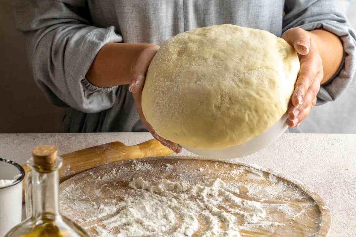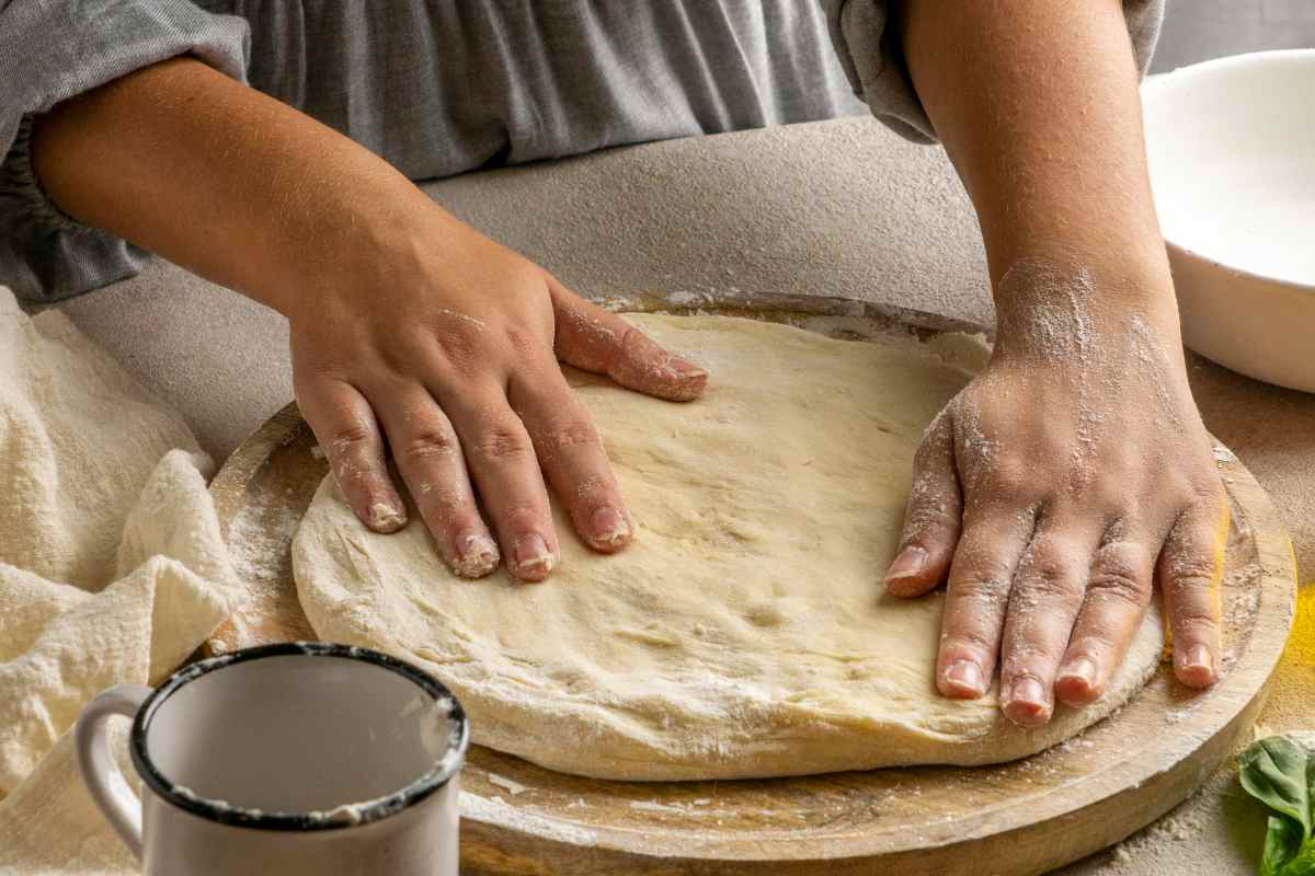 - Lascia lievitare l’impasto in un luogo caldo, coprendo con un panno da cucina, per circa tre ore. Trascorso questo intervallo di tempo, stendi l’impasto in una teglia da forno, aiutandoti con le mani (meglio se oliate, in modo tale da maneggiare meglio l’impasto). Una volta steso, l’impasto andrà fatto lievitare per un’altra mezz’ora di tempo.
