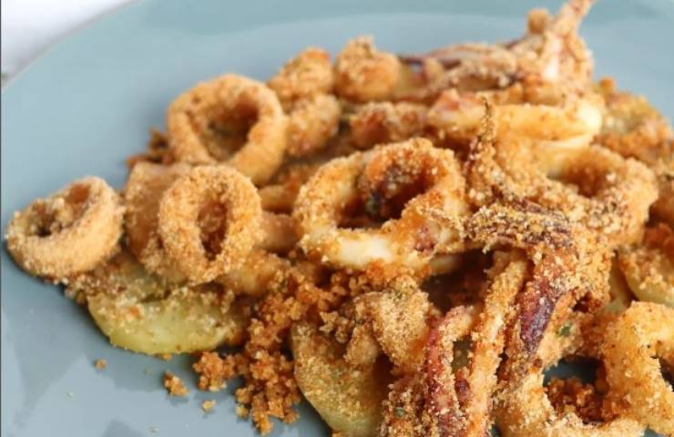 Togliete ora i calamari dal fuoco e buttateli nella panatura avendo cura di andare a coprire per bene tutta la loro superficie.