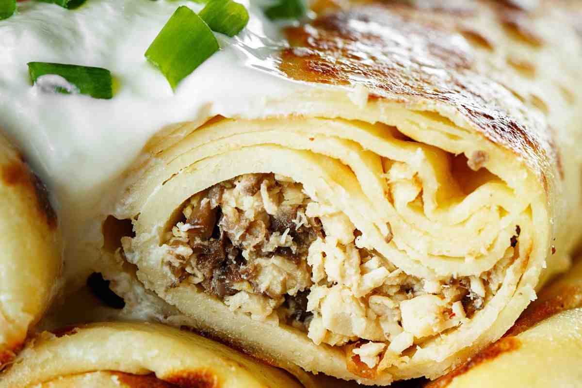 - Imburra una pirofila. Farcisci ogni crepe con il ripieno, arrotolala o piegala e sistemala nella teglia. Prosegui finché le crepe sono finite.