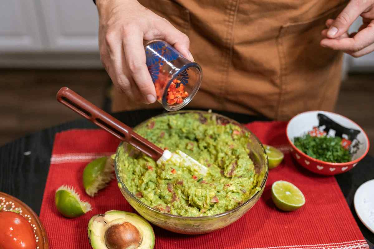 - In seguito, taglia il pomodoro ramato a dadini e aggiungi anche questo nel mortaio. Mescola con un cucchiaio e trasferisci il risultato all’interno di una bowl, così da poterlo servire nella maniera migliore ai commensali. La tua salsa guacamole, come noterai, sparirà in men che non si dica.