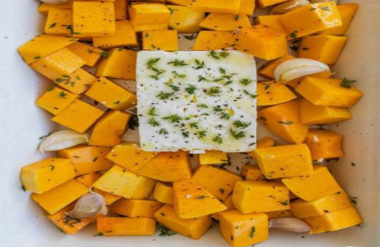 Per cominciare questa semplicissima preparazione la prima cosa da fare è sbucciare la zucca e tagliarla a dadini. Poi sistemarla in una pirofila da forno e al centro inserire la feta intera.