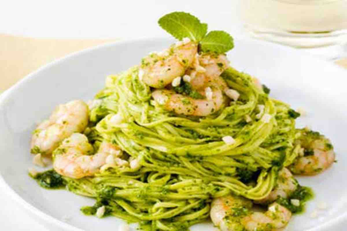 Pasta senza glutine con pesto di pistacchi e gamberi