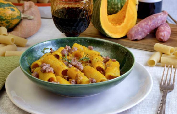 Oltre ai rigatoni, che si prestano bene per il carattere rustico e corposo e vengono avvolti molto bene dal condimento, c’è la zucca ridotta in purea che diventa una crema saporita.