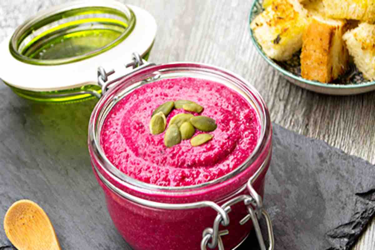 - Nel frattempo, preparate le salse, per il paté alla barbabietola in un mixer mettete due barbabietole cotte, uno spicchio d’aglio senz’anima, 25 g di yogurt greco, 20 g di pangrattato senza glutine, 20 g di nocciole tritate e 2 g di sale