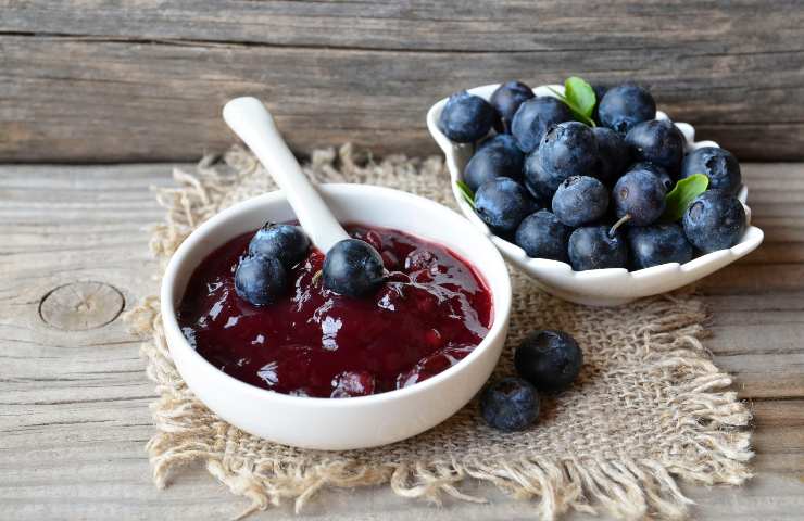 Sfornarla, lasciarla raffreddare, poi dividerla a metà e farcirla con la confettura di mirtilli. Cospargere con abbondante zucchero a velo e se si vuole, decorare al centro con qualche mirtillo o una cucchiaiata di confettura.