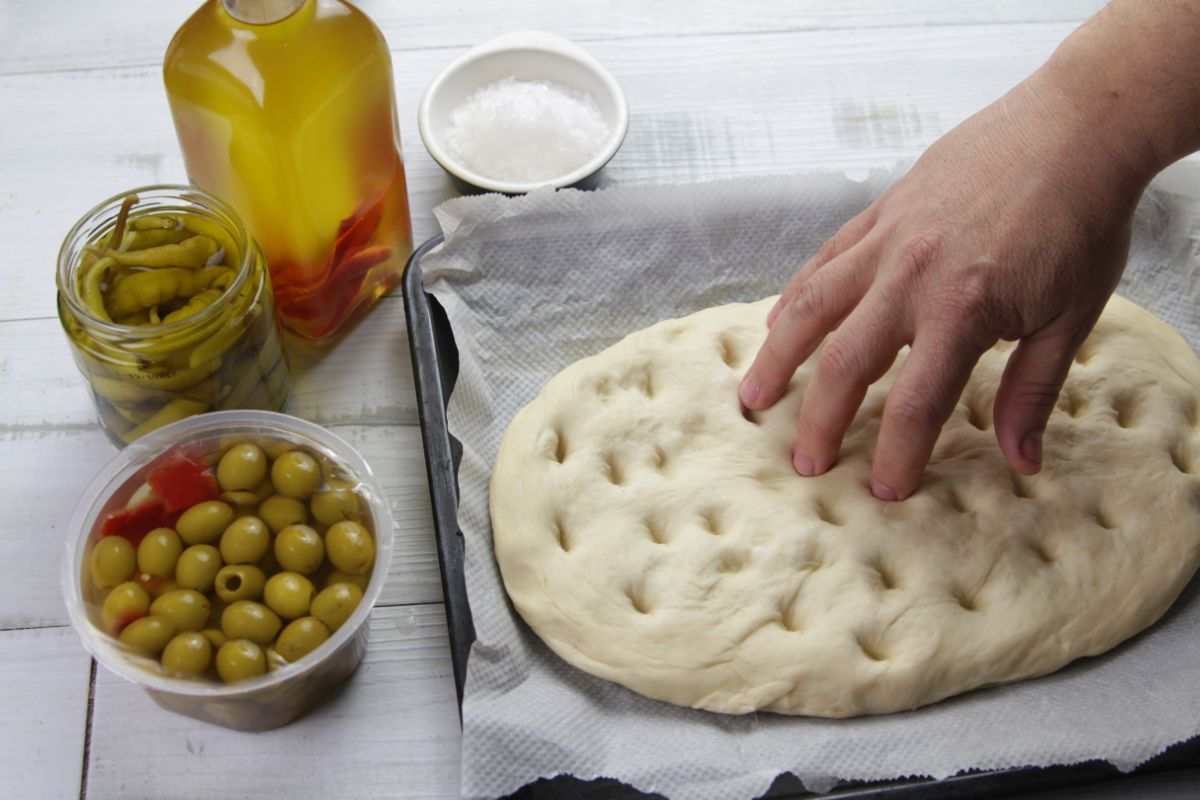 L’idratazione dell’impasto è fondamentale per una buona riuscita della tua focaccia. Le farine senza glutine assorbono più liquidi, quindi non preoccuparti se l’impasto ti sembra un po’ molle. Usa circa il 90-100% di liquidi rispetto al peso delle farine. Acqua tiepida o latte vegetale vanno benissimo.